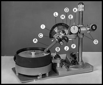 The brass thumb screw "H" allows the operator to adjust the amount of torque needed to raise or lower the dop arm.