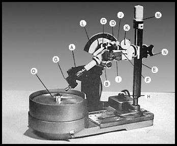 Dop arm (adjustable for concentricity to .00025 runout). The dop arm has a reference point for radial alignment.